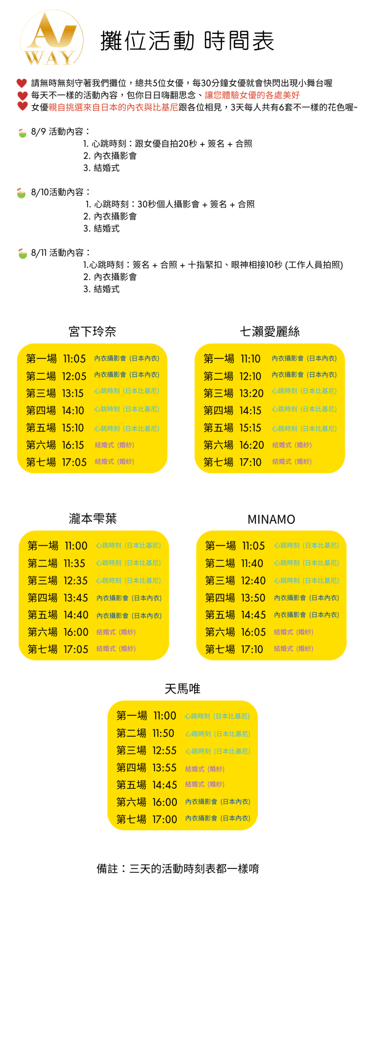 以上五位就是今年AVway的金牌五虎将,不过有好的女优还不够,还要有好的活动让大家玩才行,接下来就公布时间表来说明这次AVway的活动: