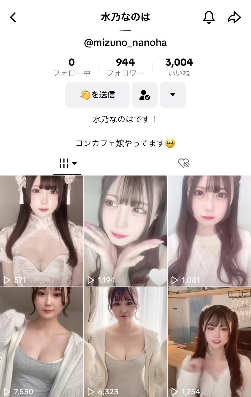 所以你用水乃なのは(水乃菜乃华)的艺名去查很快就可以找到她的Tiktok(https://www.tiktok.com/@mizuno_nanoha),然后在作品文案中也提到她并不讨厌被关注的感觉,最重要的是,她喜欢做爱,身体敏感的不得了〜