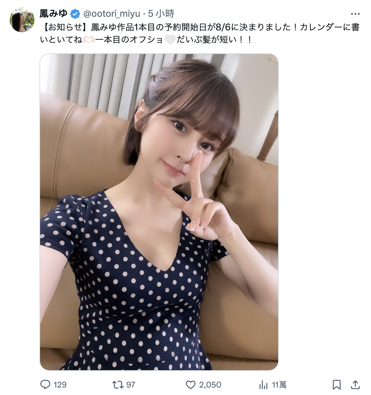 在X(https://x.com/ootori_miyu)宣布回归拍片后,凤みゆ(凤美优)进一步告诉大家,全新艺名的第一支作品将会在8月6日接受预约: