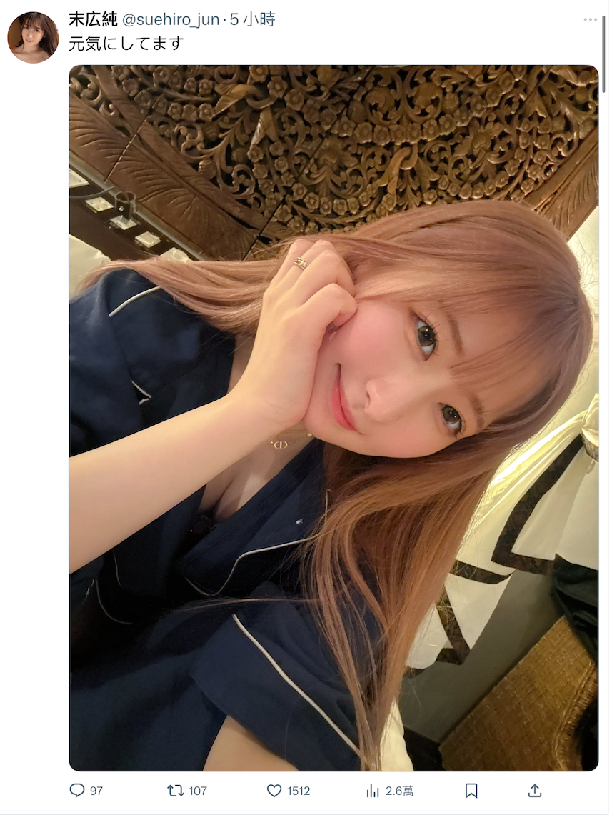 除了没写什么,就是上传自拍照告诉大家「元気にしてます(我很好)」,至于为什么要特别讲述内容?一定知道不健的忘,末広纯上一次更新社群已经是1个月的事了…