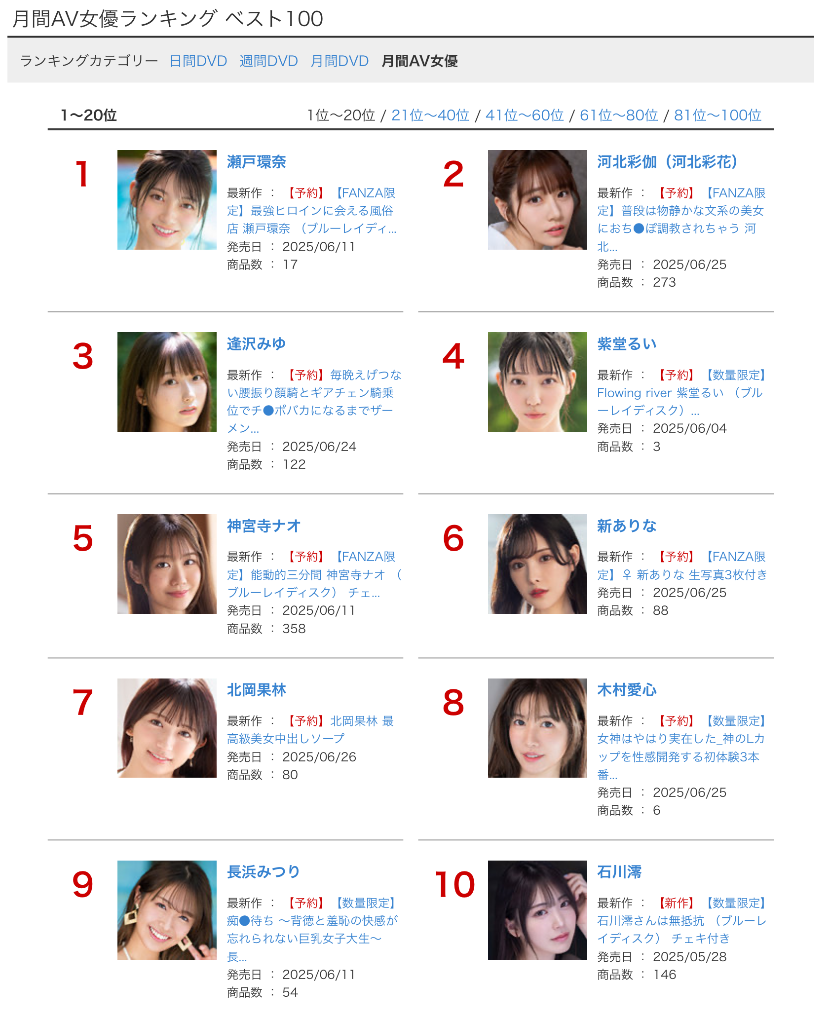 以上,是FANZA通贩部门、也就是贩卖实体片的排行榜心得。