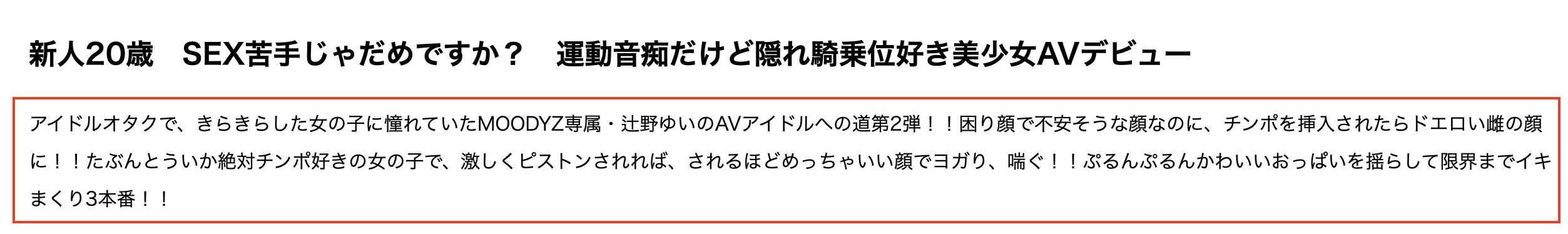 然后Moodyz就犯了大错,他们把夏色みか(夏色美香)出道作的文案误植为另一位新人「辻野ゆい(辻野唯)」的第二支作品,这是很严重的失误(而且到现在还没更正);不过还好,因为是新人所以片商都会把剧照上字,所以要了解夏色みか(夏色美香)并不难,我们首先要了解的就是她运动白痴到了什么程度,马上来看个明白: