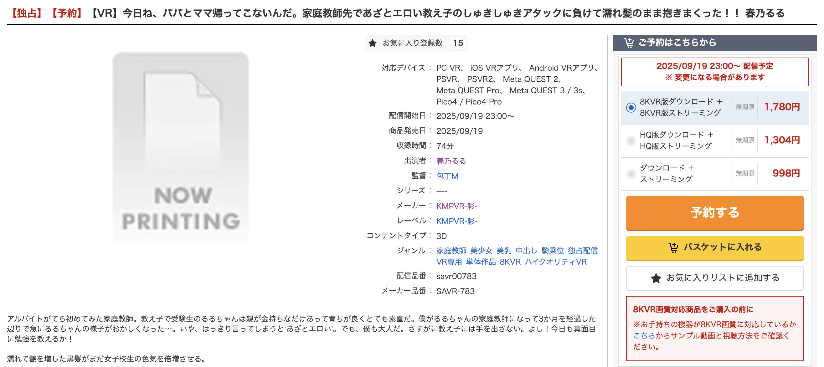 作品是《【VR】爸爸妈妈今天不回家。在辅导班被调皮捣蛋的学生攻陷,结果湿着头发抱住了他!》,由电影公司KMPVR-Sai发行。这是一部VR电影,将于9月19日上映。由于她本人已经与公司进行了沟通,因此无需咨询。她尚未签订专属合约,因此您可以在各电影公司发布的众多项目和个人女演员(Kikatan)中随意选择。