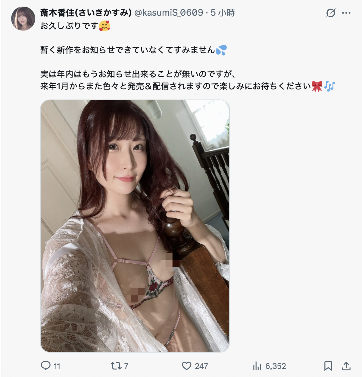 她是在自己的X(https://x.com/kasumiS_0609)上宣布这个消息的,从8月29日后就没再发文的她先是和大家问候好久不见了,然后就直说了,接下来到12月都不会有新片上市了,不过从明年1月开始就会有各式各样的作品发售以及登上串流平台,敬请期待〜