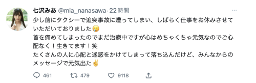七沢みあ(七泽米亚)在twitter上告诉大家,因为车祸受伤的缘故,她必须要暂时休息一下,不过也请大家不用担心,虽然有皮肉伤,但她活得很好,看到大家打气的留言让她很感动,满血后就会重返工作岗位:
