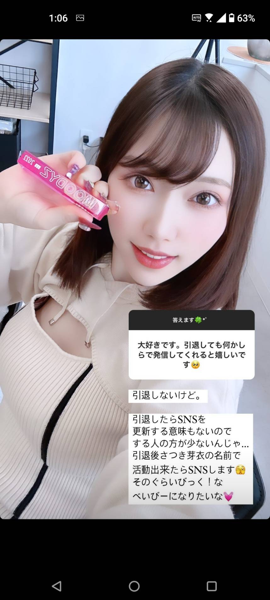 一样是IG限动,さつき芽衣(沙月芽衣)说自己前几天今年第一次开工拍片,觉得拍片现场还是很Happy的,休业淡出引退的想法也烟消云散ー之前為什麼有那麼负面的想法呢?さつき芽衣(沙月芽衣)说是因為周围的大人一直跟她强调自己的排名顺位有所下滑,让她愈想愈沮丧所以就慢慢不想去现场,可是一听到导演喊开麦拉就觉得有片子拍有炮打真是HIGH啊⋯