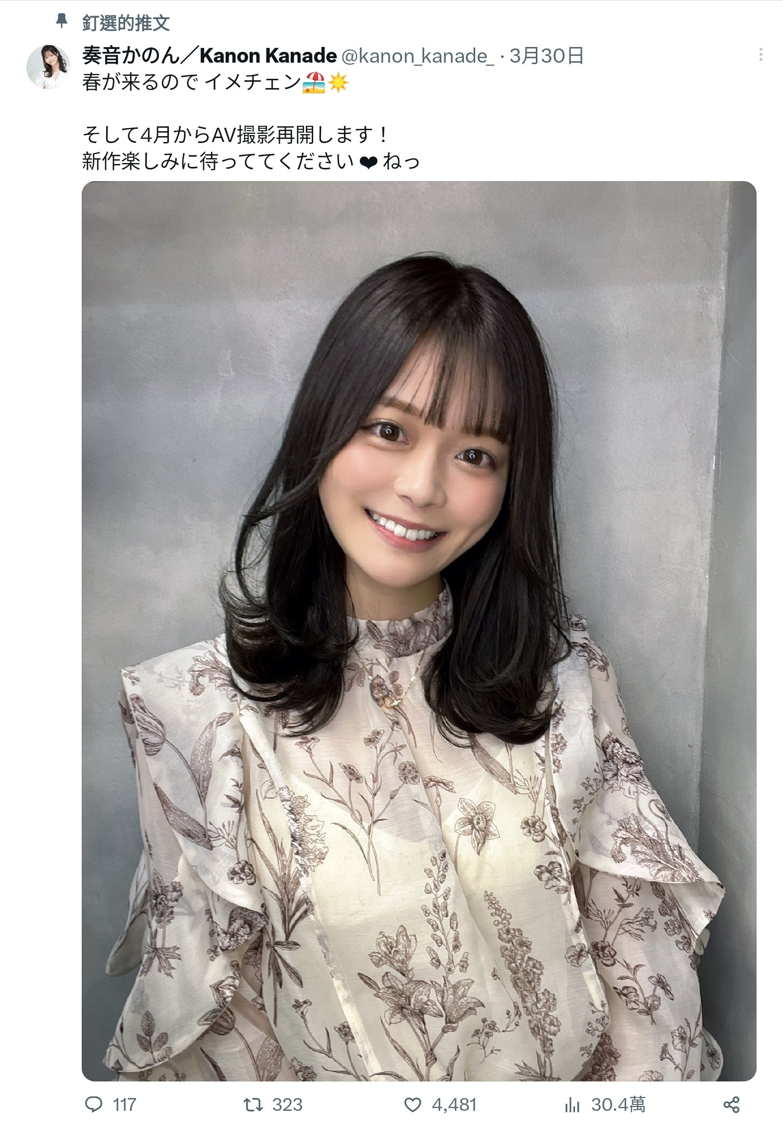 然后她宣布,自上个月(2023/4)开始,重新投入AV拍摄的工作!