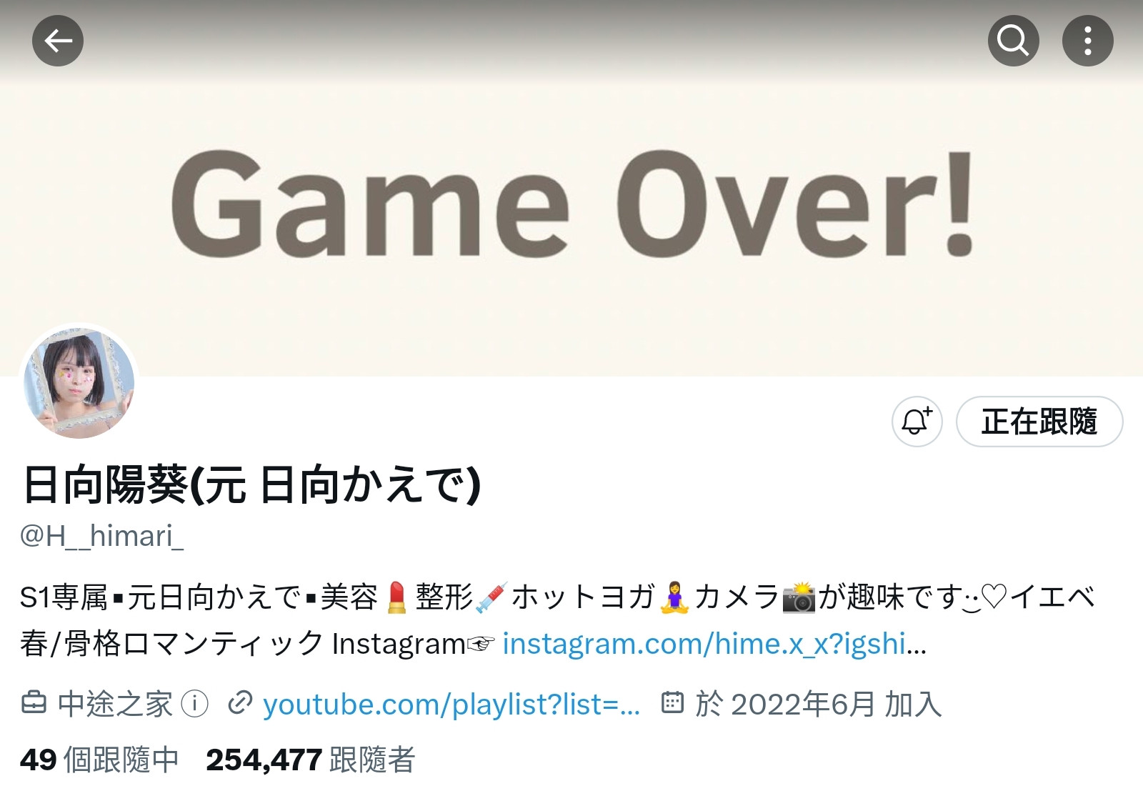 正确来说是日文的那个twitter不见了,她用「阳葵」之名注册、用来学习中文的帐号还在,这实在有点奇怪啊,以她之前热爱经营社群简直就像纠察队的行径来看肯定出了什么事,但如果不玩了又为什么留下中文帐号?她是在盘算什么?