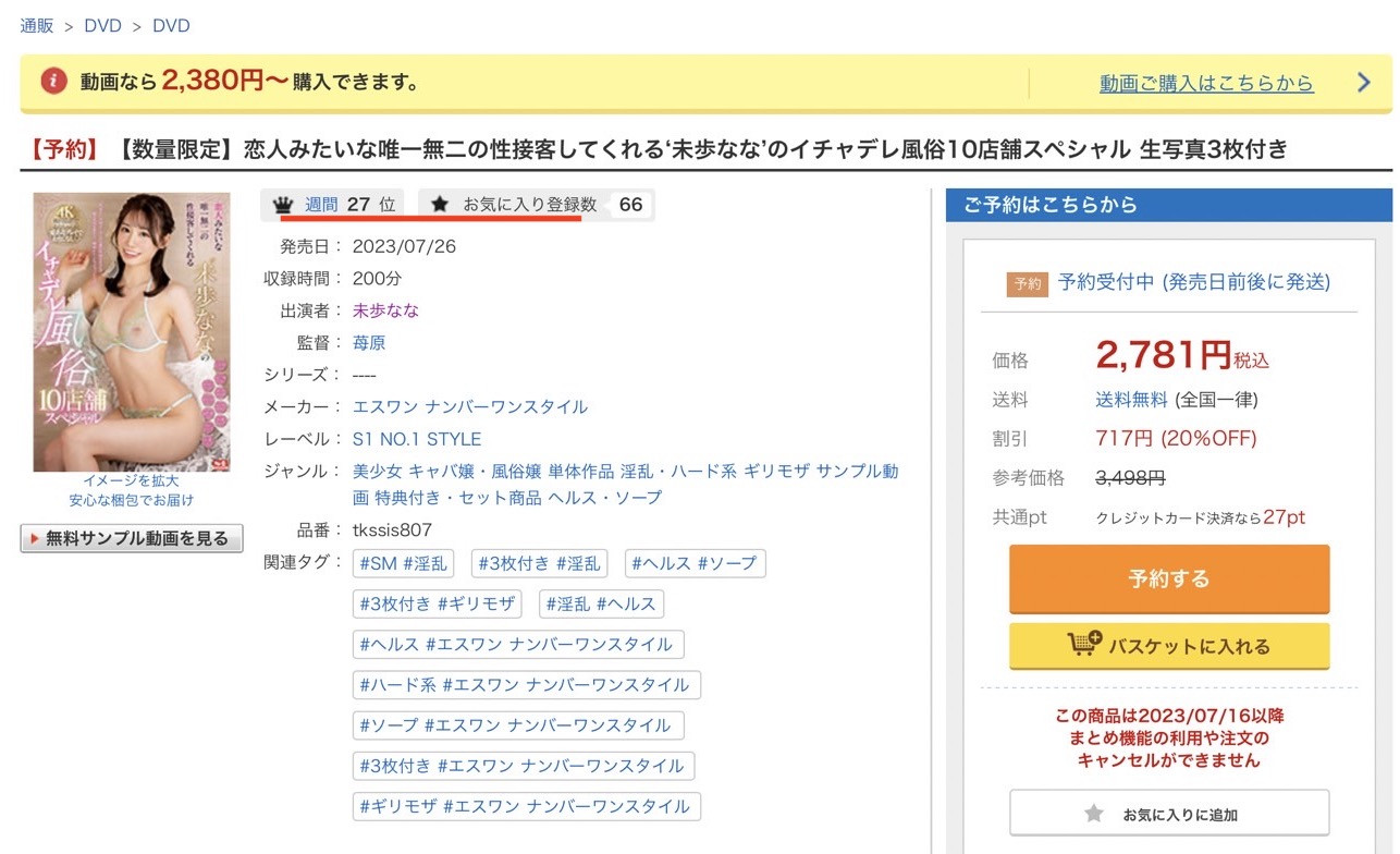 坦白说,她确实还没到最优秀的境界,最多人参考FANZA月排行榜她新片没进榜,总销售的AV女优排行榜则是排在83;周排行榜她的名次比较高,新作「恋人みたいな唯一无二の性接客してくれる“未歩なな”のイチャデレ风俗10店铺スペシャル」排在第27名,我想她之所以会有这感触应该是第一张合约已经走完了(专属12支作品),虽然继续待在S1的机会很大,但她并不满意自己的成绩⋯