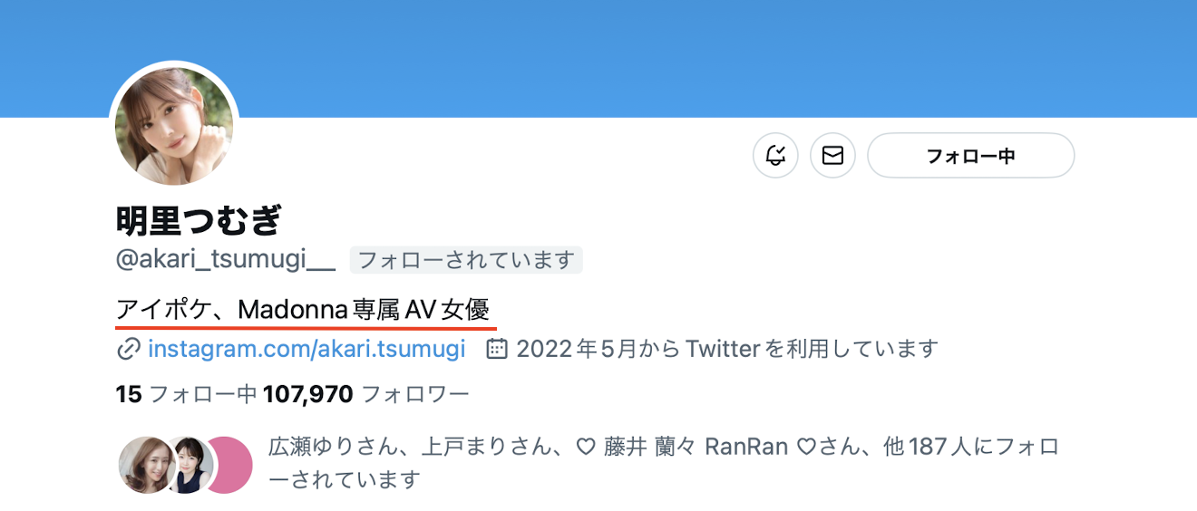 除了作品侧标有「専属」的标签,明里つむぎ(明里紬)也在twitter的自我介绍栏说自己是アイポケ(IP社)、Madonna専属AV女优;所以没问题了,虽然离开了溜池ゴロー,但明里つむぎ(明里紬)仍然两家片商共同专属的女优而且同样会维持一片比较S一片比较M的演出〜