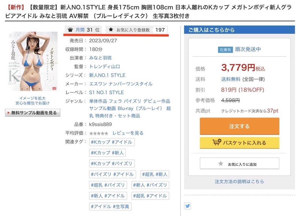 FANZA月间排名第31位,还有再加油的空间,但一来片商藏太深,在片子发出来之前就只有那一段遮遮掩掩的试看影片,二来情报解禁没多久她就被揭露有大量无码演出的历史,可能多少有影响到作品的销售⋯
