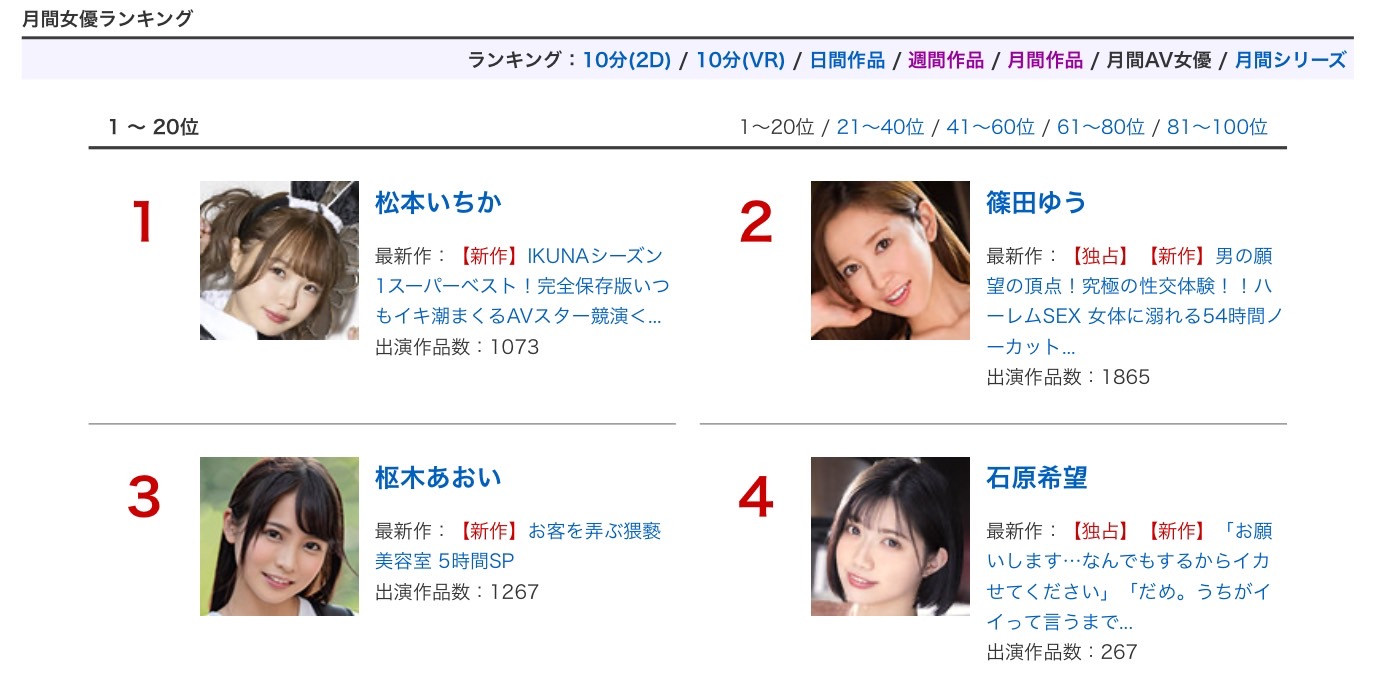 最后还是要看看串流排行榜,虽然去当专属女优了,但松本いちか(松本一香)还是没有对手继续连霸中,上次断她纪录的是大网红うんぱい(Unpai),不知道下一个能从她手里抢走冠军的是谁?