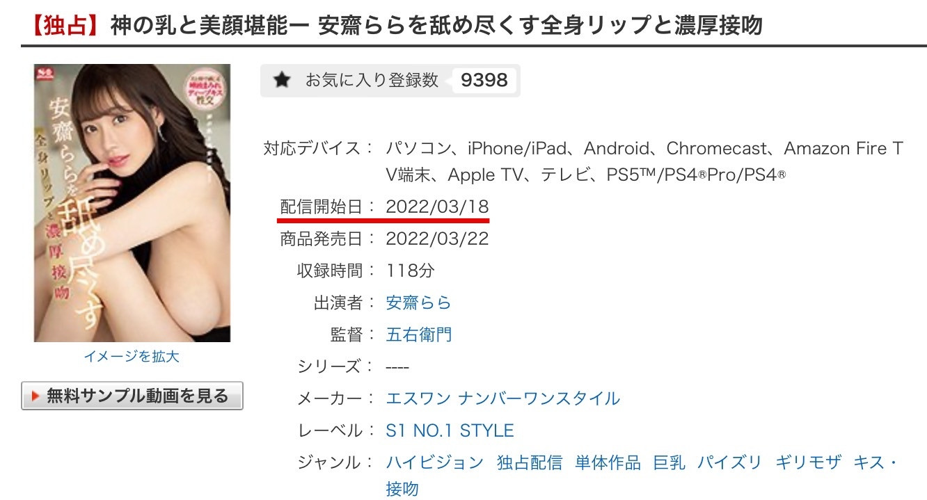 不卖关子了,是安斋らら(安斋拉拉)的作品「神の乳と美颜堪能ー安斋ららを舐め尽くす全身リップと浓厚接吻」在串流平台发售两周年的日子,可会有人觉得奇怪,我干嘛特别拿这支番号SSIS-357的片子出来讲?原因很简单,就是ー