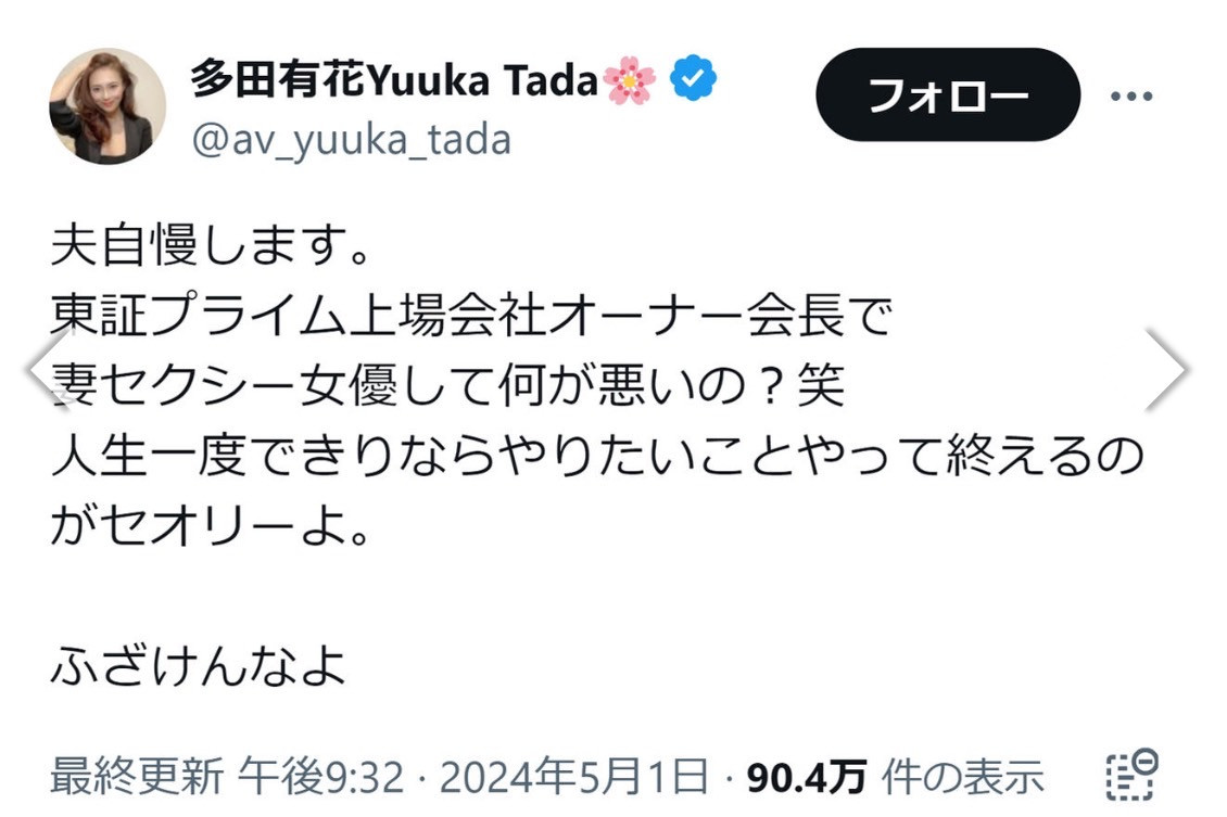 我不是批判多田有花,面对网路暴力选择反唇相讥并不是错,只是从这次的风波就大概知道为什么她那么容易抓狂,这不是第一次她和人家战起来也绝对不会是最后一次,喜欢吃爆米花配可乐看戏的朋友可以把她的X(https://twitter.com/av_yuuka_tada)打开通知,她是可以追踪的女优~