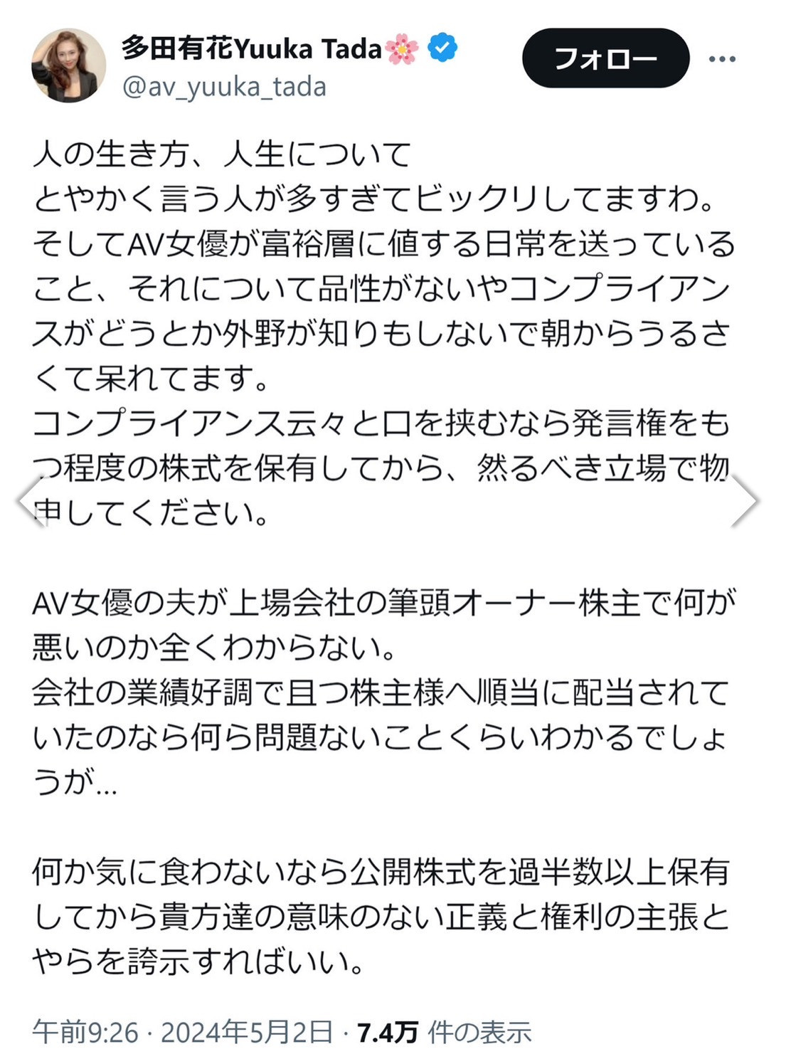 「AV女优的老公是上市公司的董事长有什么好惊讶的?只要公司经营上轨道然后买股票有赚钱那就没问题了吧?想批判的话,你手上好歹要有我老公公司过半的股票吧?」