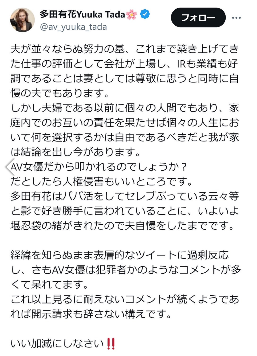 这样讲就灭火了吗?没有,当然没有,因为网民就是你愈呛愈要酸的一群人,所以多田有花又再一次对家庭内的夫妻关系做了解释:「我们是夫妻也是独立的个体,在履行家庭义务外也都有选择自己生活的权力,看到那么多评论把AV女优当做犯罪者一样看待真是让人惊讶,再胡说八道咱们就法院见!」