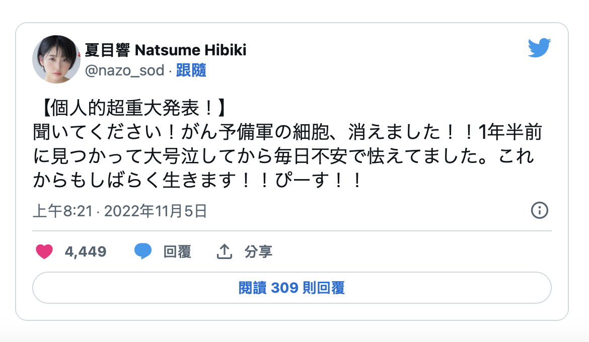 不过还好,在最新一次的检查已经没问题,癌细胞消灭了,所以夏目响开心地说自己会活很久、Peace!