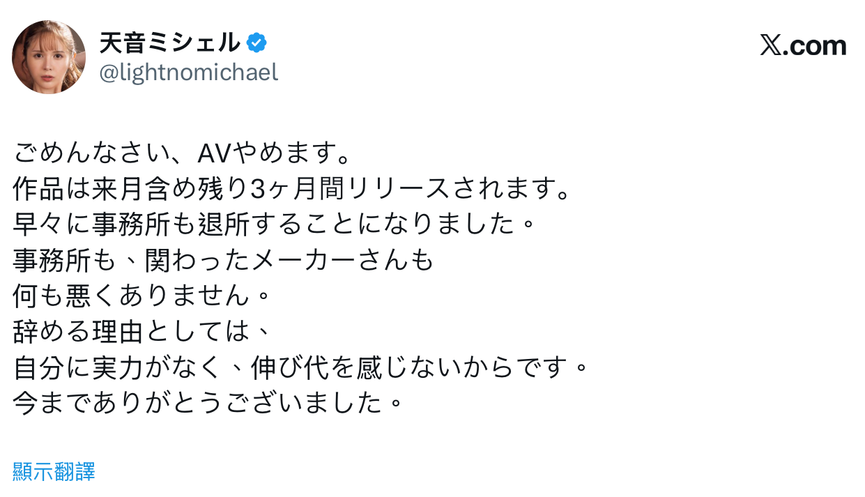 为什么呢?天音ミシェル(天音蜜雪儿)在自己的X(https://x.com/lightnomichael)写得很清楚,让我来做个简单的翻译: