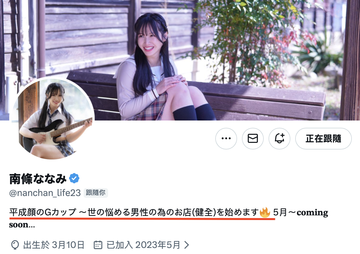 答案就在她的X页面(https://x.com/nanchan_life23)上,你可以发现她把名字改成了“南条ななみ(南条なな美)”,然后在她的个人资料中写道“平成脸的G罩杯~为天下问题男人开店(健康)5月~即将推出”,意思就是——